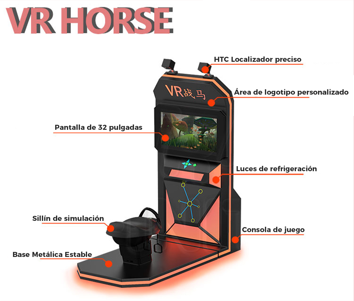 VR Horse utiliza un equipo de carreras de caballos importado con un sistema de captura de acción preciso y perfectamente adaptado a la tecnología y al carácter del movimiento. Puede funcionar perfectamente junto con muchos juegos personalizados de carreras de caballos VR. Algunas de sus ventajas son, por ejemplo, la ubicación precisa de MM, la rotación libre en una sala ilimitada, la imagen fluida, la alta resolución, la posición sensible, la gran maniobrabilidad y la baja sensación de mareo. La gran cantidad de juegos divertidos creará el máximo disfrute de la visión, el oído y el movimiento. ¡Añadidos algunos elementos de fitness es posible que los jugadores obtengan sorpresa y estimulación sin precedentes!